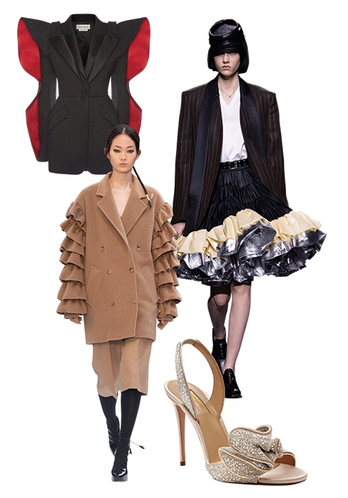 어깨, 소매, 밑단 모두 부풀리고 또 부풀리는 것이 이번 시즌의 메인 트렌드. 그리고 풍성한 실루엣을 만드는 데 가장 효과적인 도구가 바로 러플이다. 하지만 사랑스러움의 전유물로 여겨지던 이 디테일을 보는 디자이너의 시각에 변화가 생긴 사실에 주목할 필요가 있다. 이번 시즌 항해와 모험을 주제로 한 막스마라는 겹겹이 쌓아 올린 러플 장식 소매로 대담하고 강인한 여성상을 나타냈고, 알렉산더 맥퀸의 사라 버튼 역시 ‘용감한 영웅’이라 표현한 여성을 그리며 큰 러플 디테일의 테일러드 재킷, 드레스를 내놓았다. 한편 오래된 것, 규율을 향한 도전과 함께 오로지 즐거움을 좇는 자유분방함을 주제로 한 루이 비통의 컬렉션에선 발랄한 러플 스커트의 행렬이 이어졌다.
