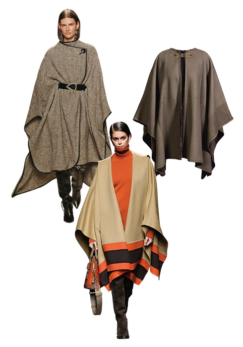 (위부터 시계방향으로) isabel marant, Loro Piana, michael kors collection 케이프, 판초는 가을, 겨울에 빠지지 않고 등장하는 클래식 아우터. 이번 시즌에는 마치 블랭킷을 두른 것처럼 보이는, 품이 넉넉하고 길이가 긴 아이템이 유행이다. 손과 무릎이 보이지 않을 만큼 큰 사이즈의 헤링본 판초에 톤온톤 부츠와 벨트를 함께 스타일링한 이자벨 마랑, 오버사이즈 케이프 아래로 얼굴까지 올라오는 긴 터틀넥과 롱부츠를 매치해 프로포션이 좋아 보이는 효과를 연출한 마이클 코어스 컬렉션. 이 밖에도 셀린느, 지방시, 페라가모, 마크 제이콥스 등의 쇼를 참고해 트렌디한 스타일링을 즐겨볼 것. |