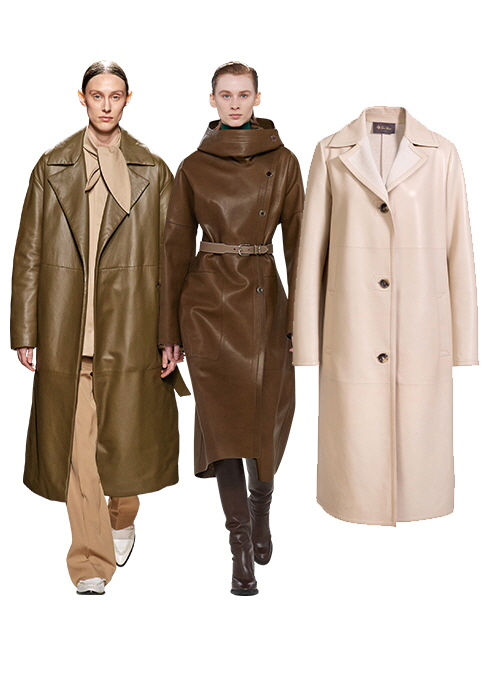 (왼쪽부터) tod’s, HermÈs, Loro Piana 올 레더(all leather) 룩이 펜디, 미우미우, 디올 같은 빅 브랜드의 쇼에 심심찮게 등장하는 가운데, 트렌드에 민감한 이라면 그 중심에 레더 코트가 있음을 눈치챘을 터. 특히 일찍부터 레더 제품을 다루며 노하우를 쌓아온 브랜드에서 선보이는 부드러운 감촉의 롱 레더 코트는 이루 말할 수 없이 탐스럽다. 소재 자체가 지닌 힘이 있기 때문에 장식적 요소를 제외한 심플한 스타일링이 가장 멋스럽다. 에르메스, 페라가모, 토즈 등을 참고할 것. |
