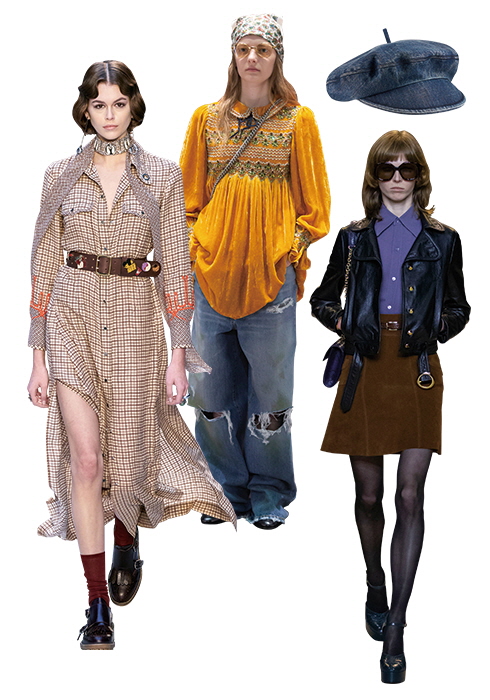 (왼쪽부터 시계방향으로) chloÉ, gucci, Dior, celine 1970년대의 프렌치 부르주아 룩을 향한 에디 슬리먼의 사랑은 이번 시즌에도 계속됐다. A라인 스웨이드 미니스커트, 짧은 가죽 재킷, 벨보텀 팬츠, 글램록 스타일의 화려한 드레스가 연이어 등장하며 그가 향하는 지점을 정확히 가리켰다. 한편 2015년 구찌의 수장으로 부임한 이래 늘 과거와 현재가 공존하는 컬렉션을 펼친 알레산드로 미켈레는 이번 시즌 백스테이지를 무대 위로 올리고, 자신의 시그너처를 망라한 컬렉션을 선보였다. 모즈 룩을 연상시키는 미니스커트, 히피풍의 페전트 블라우스, 데님, 셋업 수트 등 1960년대와 1970년대를 대표하는 아이템이 한데 어우러졌다. |