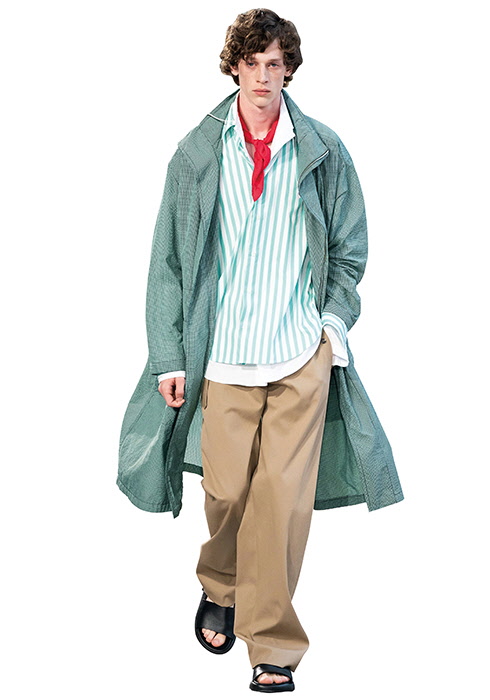 이번 시즌 영감의 선택지는 바다였다. 프라다, 랑방, 로에베 등이 낙낙한 실루엣의 세일러 톱, 노티컬 스트라이프, 해군 모자, 바다의 푸르름 등 머린 보이의 아름다움을 컬렉션에 올렸다. 해군 병사들이 입는 제복에서 힌트를 얻은 요소는 바다 너머 세상을 동경하는 순수한 소년의 이미지를 담아내는 데 매우 효과적이었다. 그중 랑방의 컬렉션은 바다의 모든 것을 담아냈다. 가죽 소재 세일러 칼라를 다양한 방식으로 적용했고, 고래와 파도 프린트, 윈드브레이커 재킷과 해군 점퍼 등으로 바다 이야기를 이어나갔다.