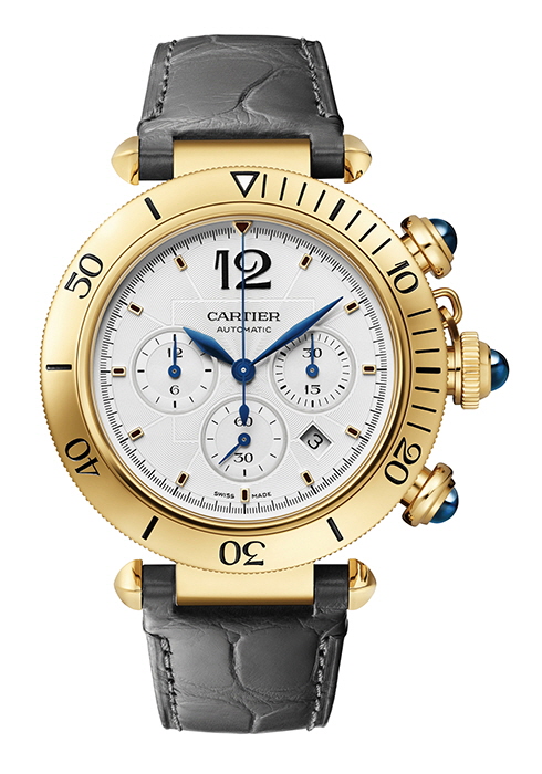 지난해 다시 론칭한 ‘파샤 드 까르띠에’는 올해 신제품 라인업에 여성을 위한 지름 30mm 모델과 지름 41mm 크로노그래프 모델을 새롭게 추가했다. ‘파샤 드 까르띠에 크로노그래프’는 블루 카보숑 컷 스톤을 세팅한 커다란 푸시 버튼과 회전 베젤을 더한 강인한 외관이 돋보이는 제품. 스틸 또는 골드 소재로 선보이며, 교체 가능한 퀵 스위치 시스템을 적용한 네이비 블루 및 그레이 앨리게이터 레더 스트랩, 스마트 링크 시스템을 겸비한 스틸 브레이슬릿과 함께 제공한다. 47시간의 파워 리저브 기능을 갖춘 오토매틱 와인딩 메캐니컬 무브먼트 1904-CH MC로 구동한다.