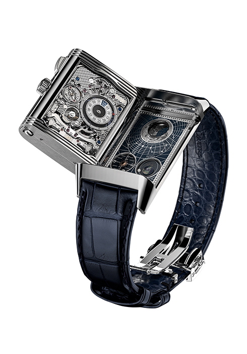 올해 예거 르쿨트르는 메종의 아이콘 ‘리베르소’ 탄생 90주년을 맞아 6년 이상의 기간을 거쳐 개발한 그랑 컴플리케이션 워치를 공개했다. 세계 최초로 하나의 시계에 4개의 다이얼을 장착했으며, 무려 11개의 컴플리케이션 기술을 적용했다. 이 모든 기능을 응축한 인하우스 매뉴얼 와인딩 칼리버 185를 지름 51X31mm, 두께 15mm에 불과한 화이트 골드 케이스에 담은 것 또한 놀라운 부분이다. 전면 다이얼인 페이스 1은 시·분, 투르비용, 퍼페추얼 캘린더, 날짜·일·월, 윤년, 낮과 밤을 표시한다. 케이스를 반전시키면 드러나는 페이스 2에서는 점핑 아워 방식의 세컨드 타임존 디스플레이와 미닛 리피터를 확인할 수 있다. 반대편에 위치한 페이스 3은 사실적인 모양의 북반구 문페이즈, 달의 교점 주기와 근점 주기, 월을 표시해 천문 현상에 관련된 깊이 있는 정보를 제공한다. 마지막으로 케이스 백의 페이스 4는 남반구의 문페이즈를 담고 있는데, 인하우스 메티에 라르Ⓡ 아틀리에에서 작업한 블루 그러데이션 래커 다이얼, 인그레이빙으로 별빛을 더한 스카이 차트, 핑크 골드 달이 어우러진 서정적 디자인이 아름답다. 전 세계 10피스 한정 출시한다.
