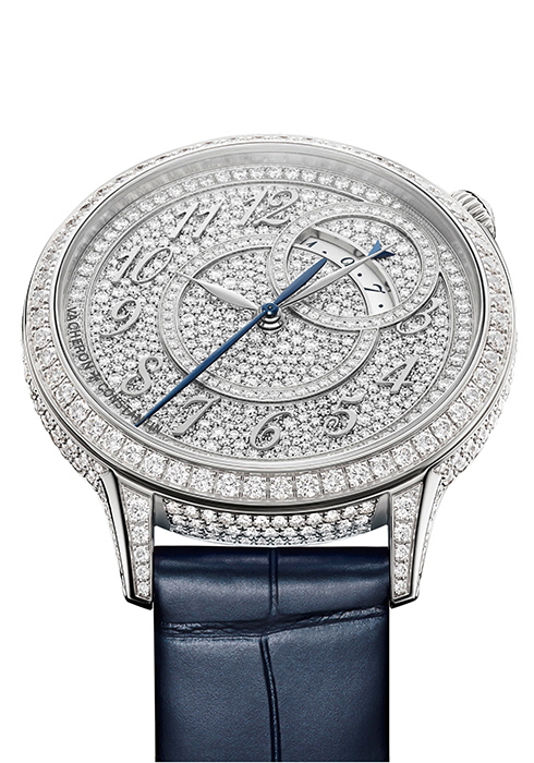 오트 오를로제리와 오트 쿠튀르의 조화가 빚어낸 하이 주얼리 타임피스. 기하학적인 비대칭 디자인과 시그너처인 오프셋 날짜창 디스플레이가 돋보인다. 지름 35mm의 화이트 골드 또는 핑크 골드 케이스에 3백3개의 라운드 컷 다이아몬드를 파베 세팅하고, 다이얼에 5백74개의 라운드 컷 다이아몬드를 장식했다. 별도의 도구 없이 손쉽게 교체 가능한 새틴 또는 앨리게이터 레더 스트랩과 함께 제공하며 40시간의 파워 리저브가 가능한 셀프 와인딩 메캐니컬 칼리버 1088로 구동한다.