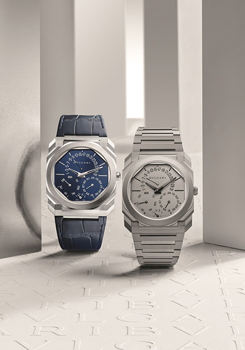 ‘옥토 피니씨모’ 컬렉션으로 울트라-신 분야에서 지난 7년간 꾸준히 세계신기록을 세워온 불가리가 올해 다시 한번 신기록을 세웠다. 세계에서 가장 얇은 ‘옥토 피니씨모 퍼페추얼 캘린더’가 그 주인공. 두께 5.8mm에 불과한 극도로 얇은 케이스 내부에, 4백8개의 부품이 완벽하게 상호작용하는 오토매틱 칼리버 BVL 305를 장착했다. 각각 12시, 3시와 5시, 7시와 9시 사이에서 날짜, 월, 요일을 표시하며 모든 기능은 3개의 코렉터로 개별 조정 가능하다. 지름 40mm의 샌드 블라스트 티타늄 케이스와 플래티넘 케이스, 두 가지 버전으로 만날 수 있다.