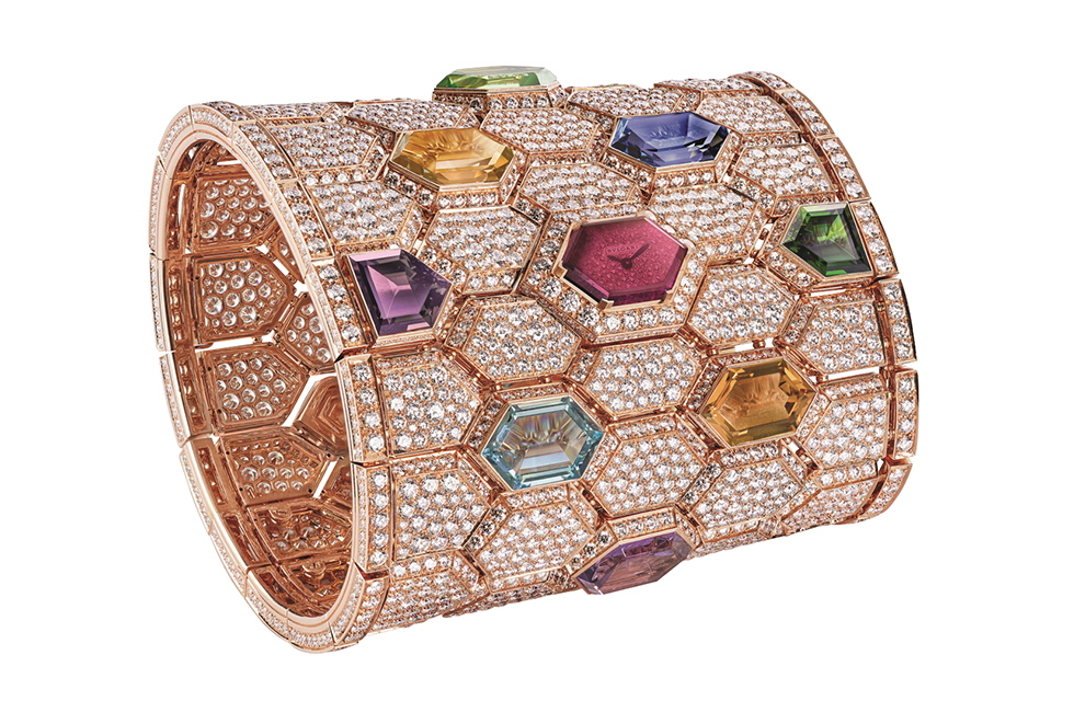로만 주얼러 불가리의 대담한 미적 감각과 탁월한 세공 노하우가 절정을 이룬 하이 주얼리 커프 워치. 유기적으로 연결된 육각형 모티브에 다이아몬드를 스노 세팅한 뒤 애미시스트, 아콰마린, 크롬 투르말린, 탄자나이트, 페리도트 등 무지갯빛 컬러 스톤으로 장식했다. 각 면을 육각형으로 처리한 5.06캐럿 상당의 루벨라이트 뒤에는 다이아몬드 풀 파베 다이얼을 숨겨두어 우아하고 비밀스러운 방식으로 시간을 읽을 수 있다. 불가리가 맞춤 제작한 불가리 로고 쿼츠 무브먼트로 구동하며, 세상에 단 하나뿐인 유니크 피스다.