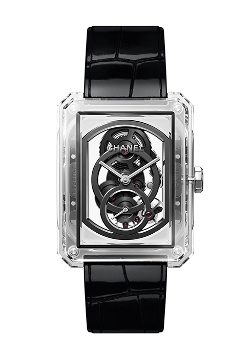 2015년 론칭한 후 간결한 라인과 균형 잡힌 실루엣으로 높은 인기를 얻은 보이프렌드 컬렉션. 처음으로 엑스레이 콘셉트를 적용한 ‘보이프렌드 스켈레톤’ 워치는 투명한 사파이어 크리스털 케이스와 베젤을 장착해 어느 각도에서나 인하우스 매뉴팩처 칼리버 3의 견고한 자태를 감상할 수 있다. 5개의 바게트 컷 다이아몬드로 장식한 크라운, 앨리게이터 패턴의 샤이니 블랙 카프 스킨 스트랩이 모던함을 배가한다. 케이스 지름은 37X8.6mm로 1백 피스 한정 출시한다.