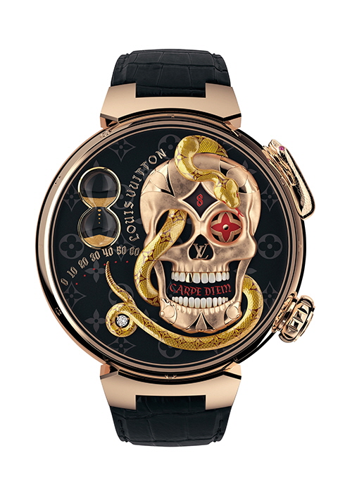 소수의 고객을 위한 스페셜 오더 워치를 제작하는 루이 비통이 선보이는 오토마타 워치. 성당 종탑에서 매시간 종을 치도록 만든 기계장치를 일컫는 ‘오토마타’는 필요할 때만 시간을 확인할 수 있는 시계의 기능이기도 하다. 케이스 오른쪽의 파충류 모양 푸셔를 누르면 중앙에 위치한 뱀의 머리가 들리면서 해골 이마 부분에 시간이 나타난다. 파워 리저브 인디케이터 역할을 하는 모래시계 아래 방울뱀 꼬리는 레트로그레이드 방식으로 분을 알리고, 해골 턱선이 움직이며 ‘카르페 디엠(Carpe Diem)’이라는 문구가 16초간 등장했다 사라진다. 이 모든 메커니즘은 루이 비통 시계 공방에서 개발한 LV 525 칼리버로 작동한다.