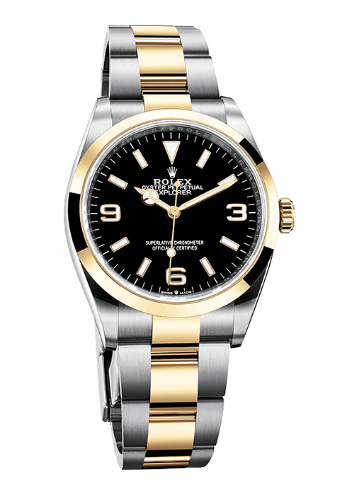 18K 옐로 골드와 오이스터 스틸을 조합한 옐로우 롤레조 버전의 차세대 익스플로러. 블랙 래커 다이얼에 더한 숫자 인덱스, 핸즈 모두 푸른빛 야광 물질 ‘크로마라이트’로 처리해 가독성을 극대화했다. 오이스터 브레이슬릿은 풀림을 방지하는 ‘오이스터 폴딩 클라스크’를 장착했고, 사용자가 직접 브레이슬릿의 길이를 조정할 수 있는 ‘이지링크 컴포트 익스텐션 링크’까지 갖춰 기능적으로 매우 편리하다. 자체 개발 무브먼트 칼리버 3230으로 구동하며 약 70시간의 파워 리저브를 제공한다. 케이스 지름 36mm.