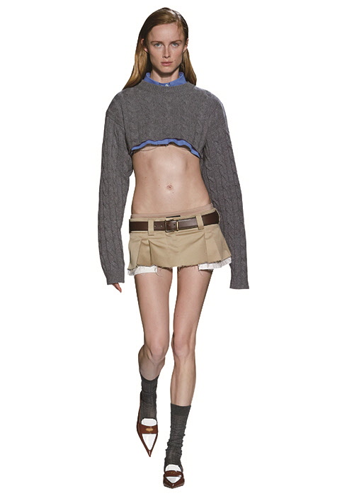 일명 ‘골반 바지’라 불리던 팬츠 스타일이 도래했다. 간신히 골반에 걸친 듯 연출하고 상의는 가능한 한 짧게 연출해 배의 상당 부분을 노출하는 것. 잘록한 허리 라인을 더욱 돋보이게 해준 브리트니 스피어스의 초창기 의상을 떠올리게 한다. 스타일리스트 로타 볼코바가 합류한 미우미우 컬렉션이 대표적이다. 가슴 밑까지 싹뚝 잘라버린 과감한 크롭트 재킷과 셔츠에 치골이 드러나는 하의를 매치했다. 클래식하고 단정한 룩에 허리선을 훤히 드러낸 반전 매력으로 올 S/S 컬렉션에서 단연 이슈 메이커로 자리 잡았다.