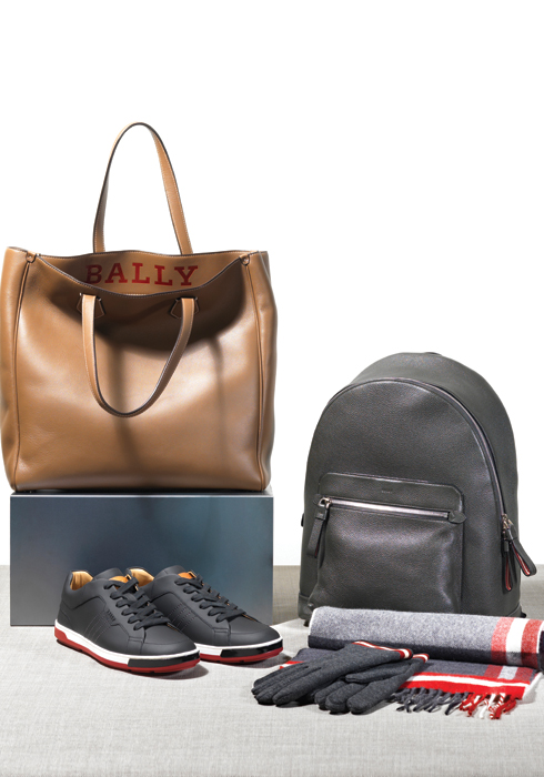 (왼쪽부터 시계 방향으로) 가방 안쪽에 브랜드 로고를 새긴 활용도 높은 모노그램 토트백, 미니멀한 형태의 견고한 가죽과 지퍼 장식이 돋보이는 백팩, 발리 고유의 패턴을 담은 울 소재 머플러와 장갑, 밑창에 포인트를 준 스니커즈 모두 발리.