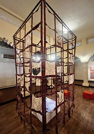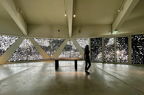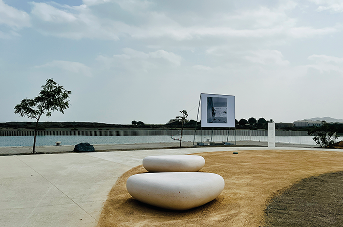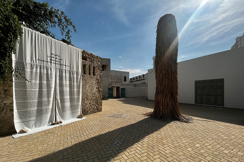 샤르자시 중심부의 멋스러운 건물들은 물론 도심에서 멀지 않은 역사적 공간도 있지만 장소성이 부각되는 이색적인 풍경과 어우러지는 ‘설치 미학’을 비엔날레 기간에만 즐길 수 있는 외딴 공간도 있다. 올해 비엔날레의 경우, 작품 수가 6백50여 점, 전시장(venue) 수가 크게 17개로 나뉘어 샤르자 전역에 흩어져 있어서다. 물론 전방위적인 비엔날레 투어는 녹록지 않은 여정일 수도 있지만, 그만큼 특별한 분위기를 선사하고, 작업과의 조우가 잘 이뤄졌을 때 뇌리에 깊이 남는다. 같은 작품도 장소에 따라 완연히 다른 느낌을 주는 경험도 재미나다. 2022년 부산비엔날레에서 주목받은 메건 코프(Megan Cope)의 패총에 대한 연구를 기반으로 한 조각은 부하이스(Buhais) 지질학 공원에서 전시되고 있는데, 마치 외계 행성에 온 듯한 건축물이 바위에 둘러싸인 이 공원에서는 다른 느낌으로 다가온다(여기에 퍼포먼스의 운치까지 더해졌다). 올봄 대구미술관에서 개인전을 성황리에 마친 이집트 작가 와엘 샤키의 작품도 ‘아랍 문화권’에서 보니 더 반가웠다. 또 샤르자 지도를 펼쳐놓았을 때 중간 지대에 자리한 ‘Buried Village’에 설치된 찔레 가시로 두른 의자를 형상화한 조각 ‘Brier Patch’(2022)도 그런 사례다. 원래는 뉴욕 매디슨 스퀘어 파크의 커미션 작업인데, ‘유령 마을’이라고도 불리는 이 황량한 모래 둔덕으로 왔다. 올해 처음 비엔날레 전시장으로 쓰였다는 이 쓸쓸한 둔덕은 미국 사회에서 흔히 보이는 ‘교육에의 장벽’을 뜻한다는 그의 작업과 찰떡궁합이 따로 없다. 영구 설치로 남을 예정으로, 작가의 말처럼 ‘시간과 함께 변해갈’ 모습이 궁금해진다. “아마도 (이곳에서는) 더 색이 밝고 단단해질지도 모르겠네요.”