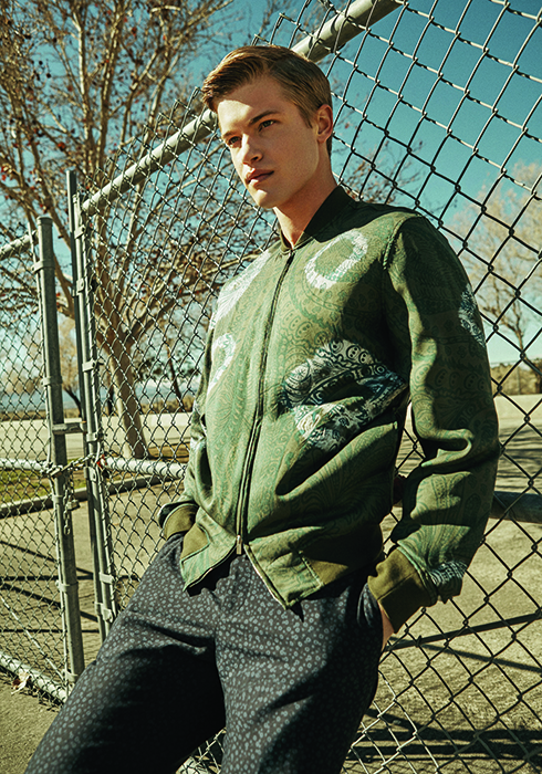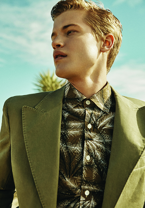 카키 컬러 재킷 2백만원대, 잎사귀 패턴이 이국적인 무드를 자아내는 셔츠 1백50만원대 모두 토즈.