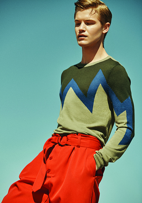 기하학적 패턴을 가미한 니트 톱, 넉넉한 라인의 레드 컬러 팬츠 모두 가격 미정 조르지오 아르마니.