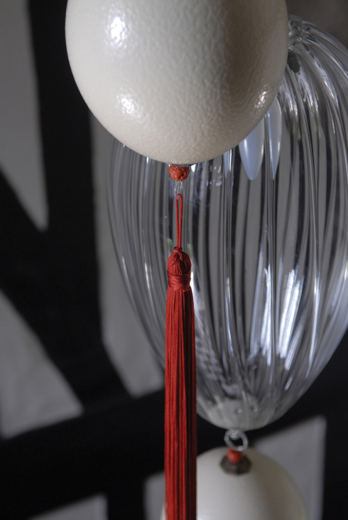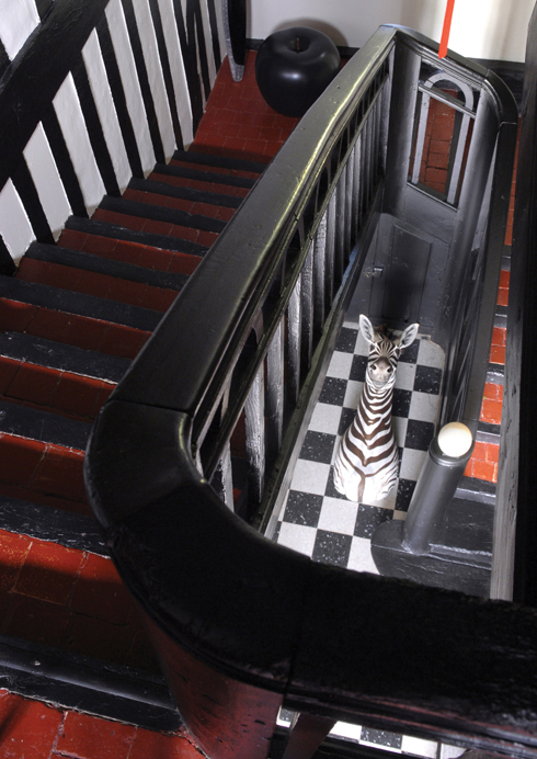 1 현관은 바둑판 무늬와 스트라이프 문양으로 장식되어 있다. 1930년대 제작한 중국 콘솔 위의 작은 들보에는 박제한 얼룩말 머리가 장식되어 있다. 계단 난간은 둥근 장식 대신 예쁜 타조알(멜리그라노 블루, Meligrano Blue 제품)로 장식했다.