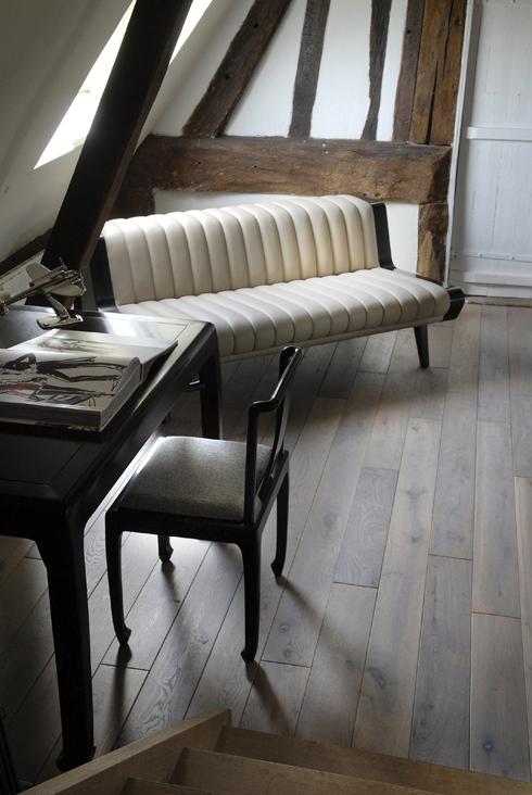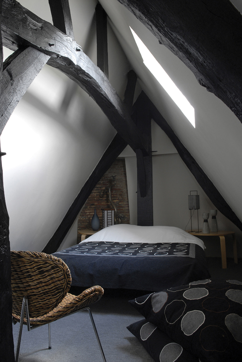 11 지붕 밑에 자리한 이 침실은 대들보와 드러난 골조에 ‘불탄 나무’ 컬러로 채색했다. 페인트는 라 세뉴리 제품. 침대 스프레드와 바닥에 놓은 쿠션은 플란넬 소재로 PMco 제품. 스테인리스 스틸 소재 다리가 달린 버드나무 소재의 의자는 PMco 제품. 램프는 조제 에스테브(Jose Esteves) 제품.