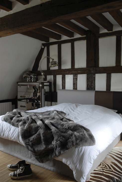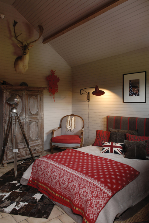 12 집주인이 사용하는 마스터 베드 룸. 침대에는 퍼 소재의 블랭킷을 덮었고 바닥에는 얼룩말 소재의 카펫을 깔았다. 트렁크를 쌓아 만든 것 같은 서랍장과 니켈 소재의 테이블 램프는 모두 앤드루 마틴(Andrew Martin) 제품.