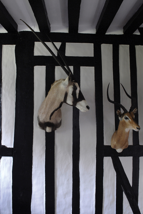 8,9 서재의 벽난로에는 수납 박스를 쌓아두었고, 끈이 긴 가죽 주머니와 앤티크 공을 놓았다. 그리고 다른 공간과 마찬가지로 골조 위에는 영양과 가젤 박제를 걸어 장식했다.