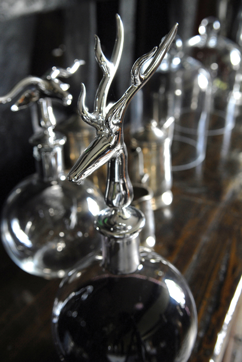 15 롬 같은 느낌의 유리 소재 사슴과 영양 머리 모양의 마개가 달린 물병은 레제리티에(Les Heritiers) 제품.