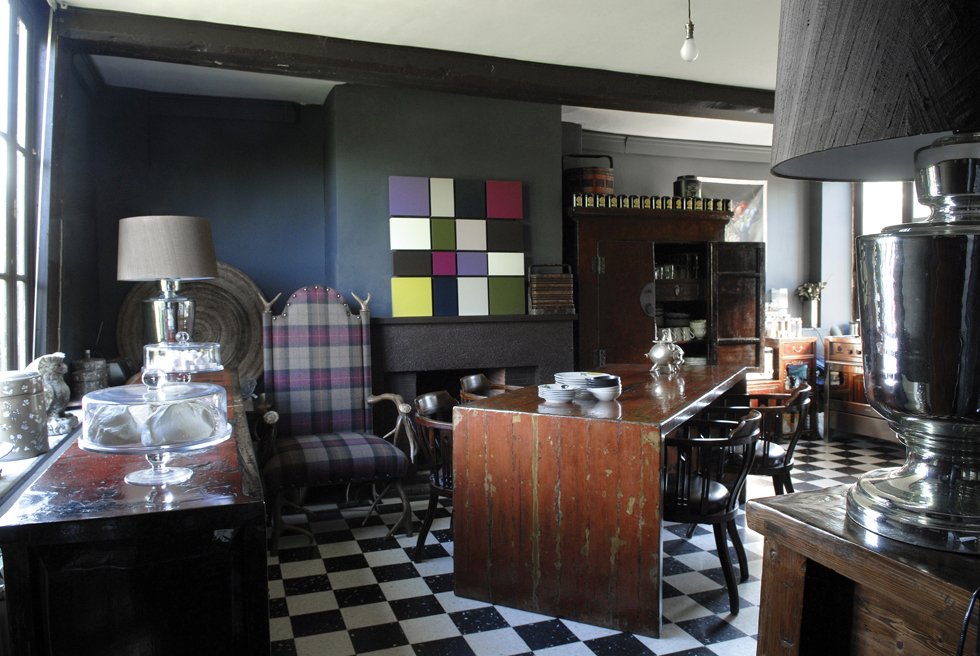 2부엌에는 중국 가구를 몇 개 놓았다. 중국에서 가져온 래커 칠한 캘리그라프 장식의 큰 테이블과 그 위에 올려놓은 접시 ‘코키(Koki)’ 는 모두 PMco 제품. 사슴뿔로 장식한 암 체어는 울 소재의 타탄 체크 패브릭(샌더슨, Sanderson 제품)으로 마감했다. 컬러풀한 바둑판 문양의 그림은 해비탯 디자이너(Habitat Designer) 제품.