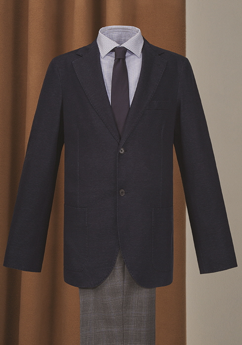 캐시미어와 실크 저지를 혼합해 실루엣이 부드러운 스웨터 재킷 4백50만원대 로로피아나. 코튼 소재 슬림 핏 드레스 셔츠 15만9천원 브룩스 브라더스. 네이비와 라이트 블루 배색이 돋보이는 BB#1 랩 슬림 실크 타이 8만5천원 브룩스 브라더스 레드 플리스.