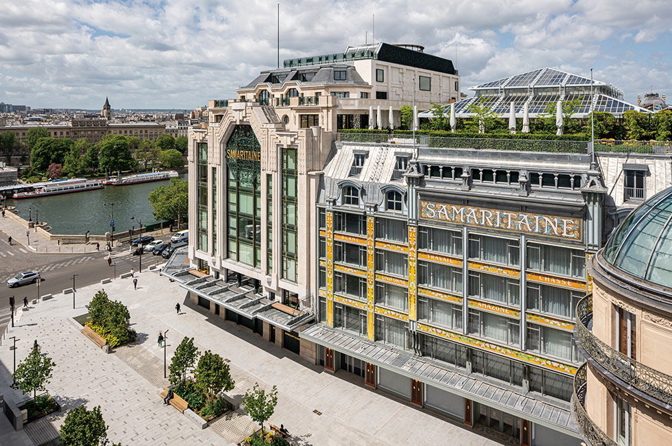 이어 지난여름, 파리에는 또다시 장안에 떠들썩한 화제가 된 주인공이 등장했는데, 이는 미술관도 축구장도 아닌 백화점이다. 퐁뇌프 다리 인근에 문을 연 사마리텐(La Smaritaine) 백화점. 하지만 그저 백화점이라고만 하기에는 파리지앵이 오랜 세월 ‘애정’해온 명소를 재단장해 16년 만에 대중에 선보인 역사적, 문화적 프로젝트다. 소설가 에밀 졸라가 ‘현대 상업의 대성당’이라고 불렀던 이 역사적 건축물을 2001년 LVMH 그룹이 인수해 무려 1조원을 들여 공사했다고 알려져 있다. 재개장 행사에 에마뉘엘 마크롱 대통령까지 참석했을 정도니 그 의미를 짐작할 만하다. 1870년으로 거슬러 올라가는 이 명물 백화점은 아르누보와 아르데코 건축양식을 품고 있는데, 센강을 바라보는 전면부는 여전히 그 같은 풍모를 간직하고 있지만 후면부는 달라졌다. 상점이 즐비한 도로를 향해 있는 후면부는 일본의 건축가 그룹 사나(SANAA)가 유리 패널을 커튼처럼 드리운 파사드를 만들어 현대적인 분위기를 자아낸다. 내부도 아르누보의 명작으로 꼽히는 공작새 프레스코 회화까지 말끔하게 복원된 퐁뇌프 건물의 고전적인 분위기와 사나가 맡은 리볼리 건물의 미니멀한 분위기는 극명하게 갈린다. 사마리텐 단지 안에는 5성급 갤러리, 스파, 사회 주택, 탁아소 등 다양한 시설이 모여 있다. 오늘날 서울을 비롯한 대다수 메트로폴리스에서 볼 수 있듯 백화점은 더 이상 커다란 상점이 아니라 복합 공간임을 보여준다. 파리지앵이 ‘사마르’라는 애칭으로 부를 만큼 백화점의 대중화를 상징했던 것에 비하면 ‘too much luxury’라는 지적이 있지만 말이다.