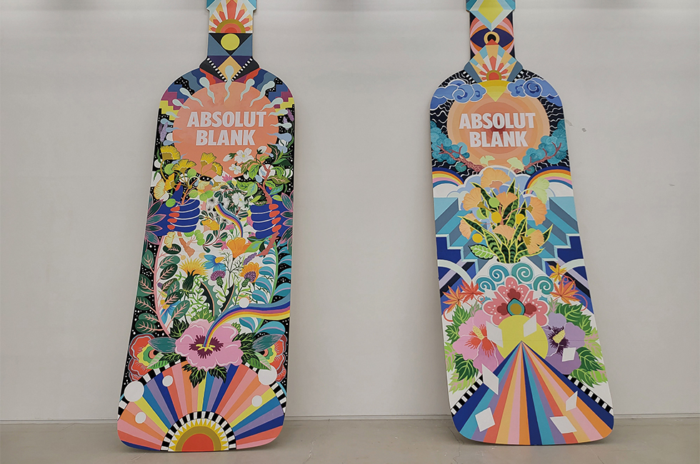 사실 소수지만 어떤 브랜드들은 (흔히 말하는 럭셔리 브랜드가 아니더라도) 이미 각자의 영역에서는 빼어난 경쟁 우위를 지니게끔 하는 역사성과 정통성을 품고 있다. 일례로 마르셀 프루스트의 연작 소설 <잃어버린 시간을 찾아서>에 부쉐론(Boucheron) 목걸이가 등장하는데, 여기서 부쉐론이란 명품 브랜드의 오라로 감싸인 이 목걸이는 단순한 보석이 아니다. 이는 나탈리 베그살라의 해석을 빌리자면, 브랜드 자체가 사회 문화적 지표이자 (작중 상황에서) 동경의 대상이기 때문이다. 여기에 동시대적인 신선한 감각까지 불어넣는 아트 컬래버레이션이 정교하게 더해지면 전통과 살아 있는 감성, 그리고 예술에서 비롯되는 영원성(timeless)에 어느 정도는 다가가는 복잡다단한 정수를 두루 갖추게 되면서 거의 ‘무적’이 되어버릴 수도 있다. 혹자는 동시대 아티스트들과의 좋은 협업은 브랜드로 하여금 전통에 입각한 영원한 빛을 발산하면서도 ‘현재’라는 유행의 흥분을 느끼게 하는 외줄타기의 묘미라고 표현하기도 했듯이 말이다. 현재 울산시립미술관에서 진행 중인 <예술과 산업>이라는 기획전에서는 이렇듯 예술을 브랜드를 고양시키는 하나의 추동력으로 삼은 사례를 전시 콘텐츠로 선보였다. 10개국 15팀의 글로벌 작가들이 참여한 전시로 자동차, 에너지 화학, IT, 음악, 패션, 영화, 식음료 등 다양한 산업 분야에 걸친 협업으로 탄생한 예술 작품들이 등장한다. 그중 보드카라는 카테고리의 럭셔리라고 할 수 있는 ‘앱솔루트’라는 브랜드가 있다. 원래는 스웨덴 브랜드로 다국적 기업 페르노리카가 2008년 인수했는데, ‘아트 컬래버레이션’의 대표 사례로 꼽힌다. 팝아트의 황제로 일컬어지는 앤디 워홀의 얼굴이나 디자인이 담긴 보드카 병을 비롯해 데이미언 허스트, 백남준, 키스 해링 등 여러 세대를 관통하는 아티스트들과의 제품 디자인 협업부터 이를 활용한 감각적인 광고 캠페인까지 ‘토털 패키지’로 예술을 활용했다. 오죽했으면 경영학계 구루들이 “앤디 워홀이 없었다면 앱솔루트 보드카는 어떻게 됐을까?”라는 얘기를 했을 정도다. 이번 울산시립미술관 전시에서는 2011년 프로젝트 ‘앱솔루트 블랭크(Absolut Blank)’의 작업 세계가 소개됐다. 당시 굿 와이브즈 앤드 워리어즈(Good Wives and Warriors)라는 영국 기반 듀오가 맡은 프로젝트로 ‘비어 있음’을 출발점으로 삼고 앱솔루트 보드카에 예술적 해석을 채워 넣는 작업도 포함됐는데, 이번에는 가로 2m, 세로 6m의 병 모양 대형 패널에 그림을 그린 작품이 새로 탄생했다.