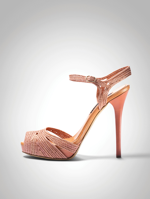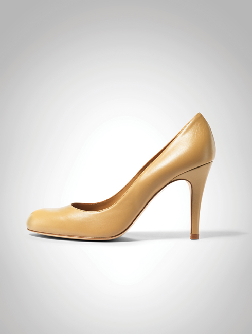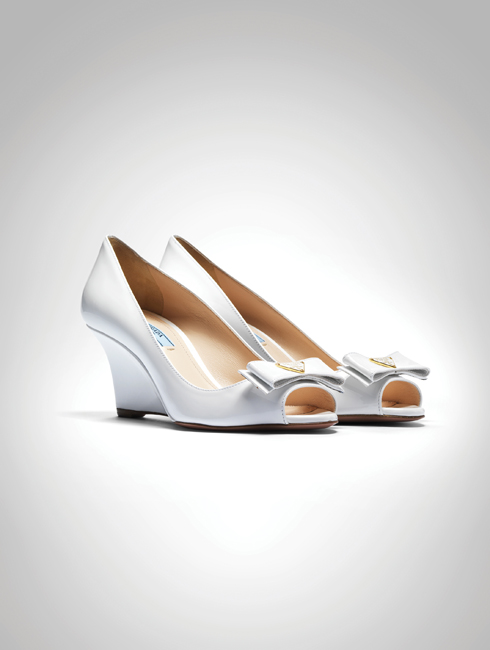 여성스러운 리본 장식이 포인트인 양가죽 오픈토 웨지힐 80만원대 프라다. 매끈한 라인과 스킨 컬러가 베이식한 펌프스 30만원대 아돌포 도밍게즈.