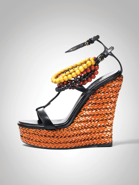 수공 염색한 나무 비즈 장식과 아찔한 높이의 플랫폼 힐이 돋보이는 웨지 샌들 가격 미정 버버리.