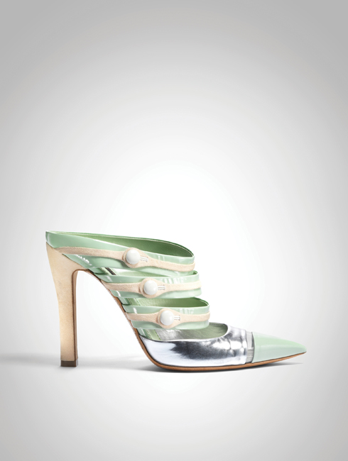 산뜻한 파스텔 민트 컬러에 반짝이는 메탈 가죽 디테일을 더한 뮬 2백만원대 루이 비통.