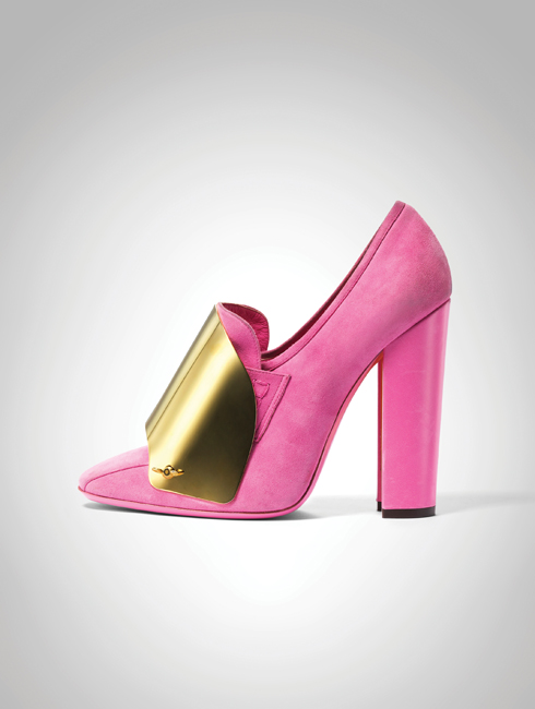 오버사이즈의 기하학적 골드 메탈 장식이 유니크한 핑크 힐 가격 미정 YSL.