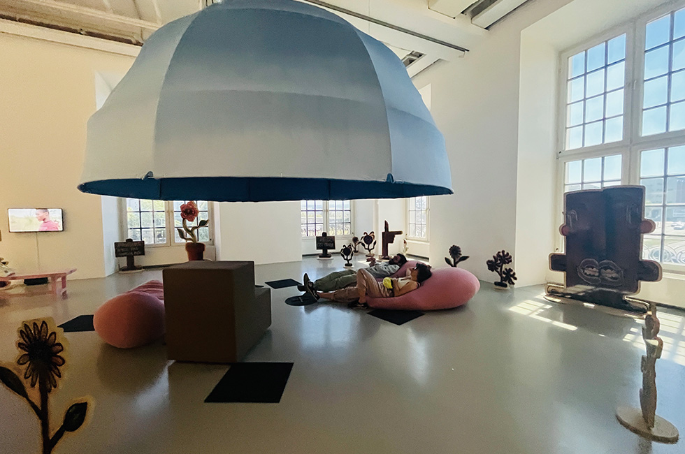 6 콩고의 와자 아트 센터는 일련의 영상 아카이브와 설치를 통해 문화 헤게모니를 벗어난, 그들만의 언어로 담론을 만들기 위한 노력을 공유한다. 둥근 천막의 안쪽 면에 설치된 영상 작품을 누워서 느긋하게 감상하고 있는 관람객들. documenta fifteen: Centre d’Art Waza, 2022, installation view, Fridericianum