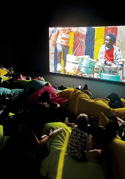 8 관객들이 빈백에 누워 와칼리가 우간다의 액션 코미디 영화 <풋볼 코만도>를 감상하고 있다. 라몬 필름 프로덕션으로도 알려진 이들은 우간다 캄팔라에서 2005년부터 저예산 영화를 제작해오고 있다. documenta fifiteen: Wakaliga Uganda, 2022, installation view, documenta Halle. Photo by JY Kim