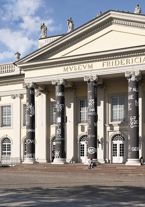 5 18세기 말에 지은 프리데리치아눔은 유럽 최초의 미술관이자 도쿠멘타의 상징적 전시장이다. 루마니아 출신의 작가 단 페르조브스키는 이곳의 정면 기둥을 룸붕의 가치에 관련된 드로잉과 글귀로 채웠다. documenta fifteen: Dan Perjovschi, 2022, installation view, Fridericianum. Photo by Nicolas Wefers