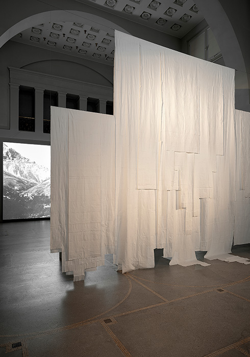 헤센주립박물관(Hessisches Landesmuseum)에는 베를린을 기반으로 활동하는 피나 외그렌지의 단채널 영상 ‘눈사태(Avalanche, 2022)’가 눈길을 은근히, 그러면서도 강하게 잡아끈다. 아버지의 고향이자 터키 남부의 국경 산악 지대인 무쿠스의 쿠르드인들이 겪은 국가적, 종교적 탄압, 그리고 자연재해로 인한 과거의 죽음과 현재의 위태로움을 눈 덮인 풍경, 아카이브 사진과 오버랩하는 이 작업은 시적인 영상미와 호소력 있는 내러티브로 상당수 관람객들로 하여금 1시간의 러닝 타임 내내 자리를 못 뜨게 만드는 힘을 지니고 있다. 입구에 드리운 티슈 설치물은 현지 여인들이 손바느질한 것으로, 떠난 이들에 대한 기억과 애도를 담고 있다. 베텐하우젠 지역의 할렌바트 오스트(Hallenbad Ost)는 1929년 바우하우스 양식으로 지은 실내 수영장으로 2009년 이후 빈 공간이었다. 도쿠멘타15는 인도네시아 컬렉티브 타링 파디의 대형 배너와 포스터, 등신대 크기의 카드보드지 인형으로 도시의 구성원들이 기억하는 이 공간의 경험을 재정의한다. 2021년 독일의 제조사 휘브너가 도쿠멘타15에 일부 양도한 산업 부지의 휘브너 에어리얼(Hu··bner areal)에서는 전시와 협업, 콘서트, 연극 등이 이루어지는 것은 물론 작가들이 만든 상품을 판매하는 룸붕 키오스크가 운영된다. 이 밖에도 풀다 강변과 도심 공원 카를스우에, 지하도로 등 카셀 곳곳에 지속 가능한 유무형의 가치, 물질/비물질의 재료, 공간, 문화적 다양성이나 갈등에 대한 접근이 이뤄지고 있다. 오프닝 기간의 룸붕 프로그램과 더불어 광장이나 공원처럼 누구나 접근 가능한 공공장소를 뜻하는 메이단(Meydan) 프로그램은 워크숍, 토크, 퍼포먼스, 스크리닝, 그리고 다양한 모임의 형태로 매달 둘째 주 주말(금요일부터 일요일)에 진행된다.