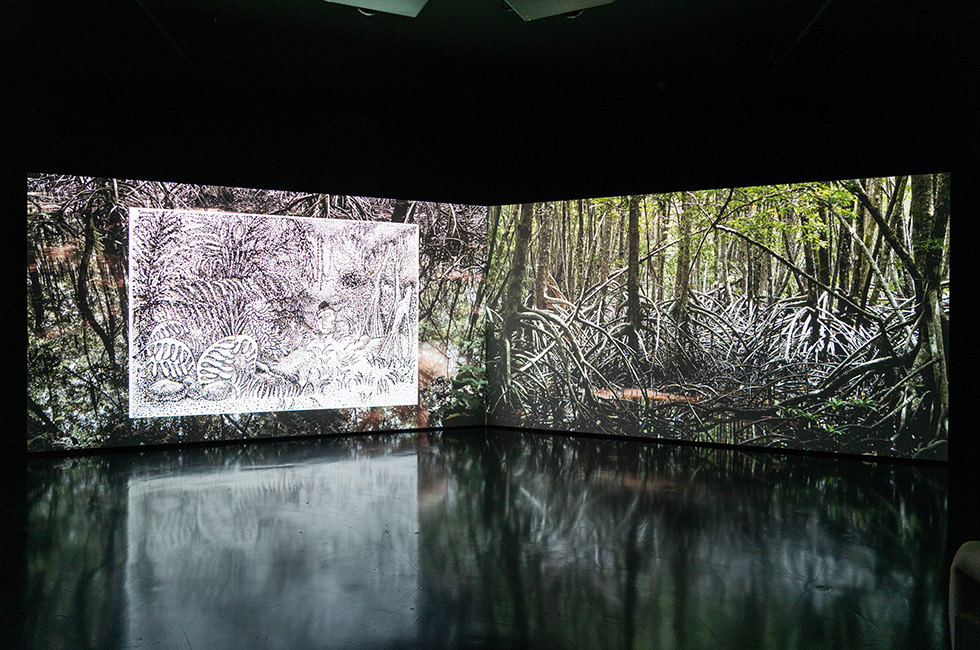 3 로마 가톨릭교회인 성 쿠니군디스에 아이티를 기반으로 활동하는 아티스 레지스탕스와 그들이 초대한 작가를 포함한 총 40여 명의 작품이 설치되어 있다. documenta fifiteen: Atis Rezistans | Ghetto Biennale, 2022, installation view, St. Kunigundis. Photo by Frank Sperling 4 이끼바위쿠르르(고결, 김중원, 조지은)의 2채널 영상 ‘열대 이야기’. 공간의 한편에 설치된 ‘기념비’는 태평양전쟁 시 보크사이트, 인과 같은 광물 자원 확보에 강제 동원되어 희생된 이들을 기린다. 보크사이트, 인, 감태, 그리고 동원 지역의 토양을 주요 재료로 사용한다. documenta fifiteen: ikkibawiKrrr, Trophical Story, 2022, installation view, Ottoneum, Photo by the artist