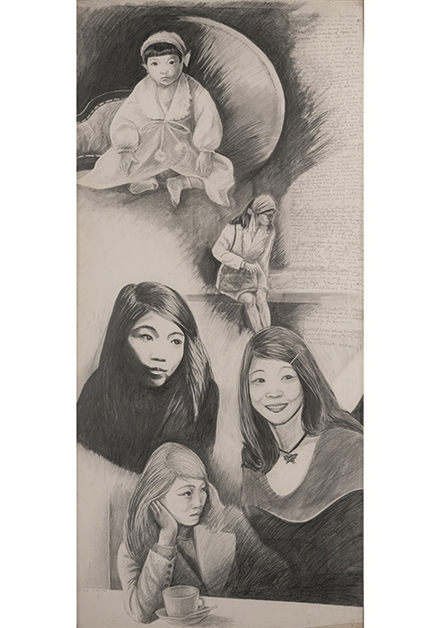●● 최욱경의 자화상은 자신의 모습을 사실적으로 묘사하듯 그린 작품부터 재료의 사용과 기법적 실험을 시도하는 과정에서 등장한 작업에 이르기까지 다양한 양상을 띤다. ‘나는 세 개의 눈을 가졌다’(1966)는 종이를 잘라 붙이는 콜라주 기법으로 제작한 작품인데, 본인의 영문 이름과 ‘나는 세 개의 눈을 가졌다(3 Eyes I Do Have)’라는 영문 텍스트를 도입한 점 등에서 1960년대 중엽 최욱경이 시도했던 재료와 기법적 실험을 확인할 수 있는 이 시기의 대표작이다. 동시에 이 작품은 아시아 여성이라는 소수자로서 신의 존재를 세 개의 눈을 가진 것과 다름없는 이질적인 존재로 표현한 점에서 미국 체류 시기의 최욱경을 가장 잘 포착한 자화상으로도 볼 수 있다. 자신의 얼굴을 사실적으로 그린 자화상 중에서는 초상 사진을 이어 붙이거나 여러 각도에서 본 자신의 모습을 함께 그린 경우에 이르기까지 본인의 여러 얼굴을 한 화면에 그린 자화상이 인상적이다. ‘자화상 연작-계속되는 나와 나의 생각들’(1976)은 어린 시절의 모습부터 이 작품을 제작한 1976년까지 변해가는 자신의 모습을 연속해서 그린 작품이다. 당시 자신의 생각을 일기 쓰듯 자화상 옆에 써 내려간 독특한 형식의 자화상이기도 하다. 이러한 작품들은 한국과 미국이라는 두 지역을 오가면서 화가이자 미술 교육자, 시인이라는 다양한 정체성을 지닌 채 활동했던 최욱경의 복합적인 모습을 반영하는 듯하다.