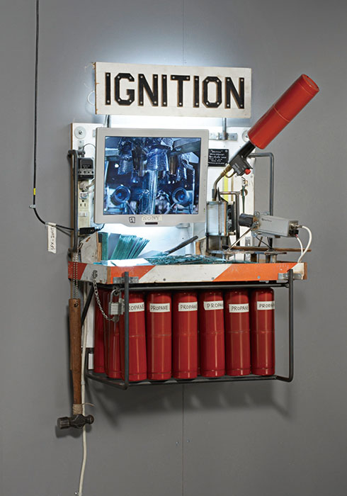 ‘Ignition’(2007-2010), ConEd barrier, plywood, latex paint, propane, steel, mirror, mixed media