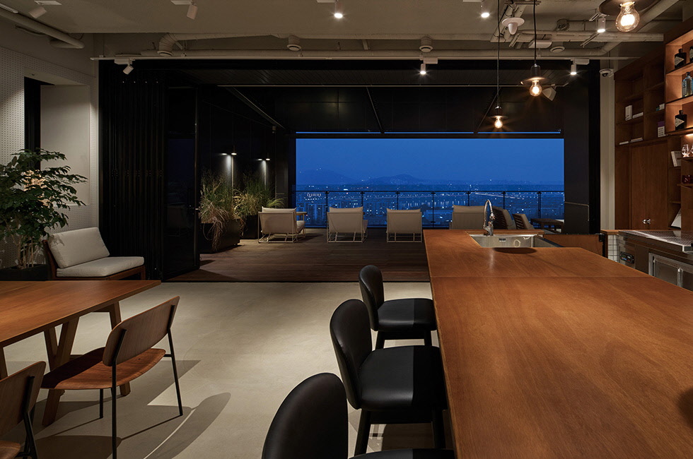 이곳에서 체크인을 하려면 리셉션이 있는 지하 1층으로 내려가야 한다. 더 정확히 말하자면 리셉션으로 이어진 호텔 입구가 건물 옆 좁은 언덕길 아래에 있다. 요즘 디자인 호텔은 로비를 1층이 아닌 외부인 유입이 적은 고층에 두는 추세인데, 안테룸 서울은 로비를 아예 없애고 대신 ‘리셉션+갤러리’ 역할을 하는 작은 공간을 지하 1층 입구에 뒀다. 투숙객 중심으로 설계해온 기성 호텔의 관행을 조금 벗어난 선택이다. 지하 1층에는 ‘로컬 예술과 문화’라는 콘셉트가 무색하게도 일본 작가 위주의 구성이라 조금 아쉽지만, 기토 겐고(Kengo Kito), 미카 시나가와(Shinagawa Mika), 다이스케 오바(Ohba Daisuke)의 강렬한 작품들이 문화와 예술을 담는다는 안테룸만의 이미지를 인상적으로 만들어냈다. 리셉션에서 한 층 더 아래에 있는 갤러리 9.5에서도 아시아 작가 중심의 기획전을 꾸린다. 방문 당시에는 배성용 작가의 <Transducer>가 열리고 있었다. 갤러리 9.5라는 이름은 안테룸 교토에 있는 갤러리의 것을 그대로 가져왔다(갤러리 9.5는 구조(九条) 역과 주조(十条) 역 사이에 위치한다는 이유에서 지은 이름). 호텔의 전반적인 아트 큐레이션은 한국에서도 유명한 스타 작가 고헤이 나와가 아트 디렉터로 있는 크리에이티브 플랫폼 샌드위치(Sandwich)가 맡았다. 앞으로는 국내 예술 기획사와도 손잡고 보다 다채로운 전시 스펙트럼을 추구할 예정이라고. 공간 미학의 백미는 꼭대기인 19층에 자리한 아트북 카페&바인 텔러스 9.5. 이곳의 테라스는 강남에서 바라보는 시원한 전망으로 소셜미디어에서 이미 유명세를 탔다. 지금은 주춤하지만 여기에서도 갤러리 9.5 전시와 연계한 프로그램을 종종 진행할 계획인데, 서점 운영과 프로그램 기획은 서촌의 복합 문화 공간 더레퍼런스와 함께 진행한다.