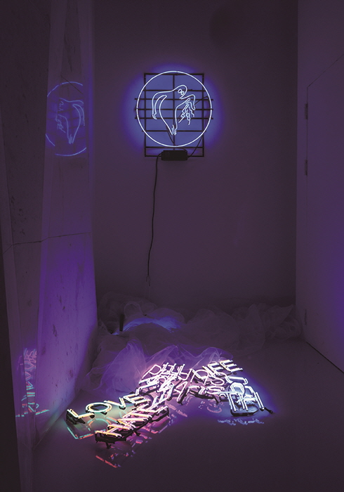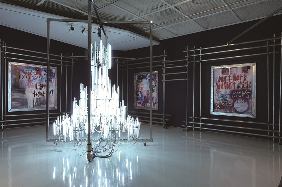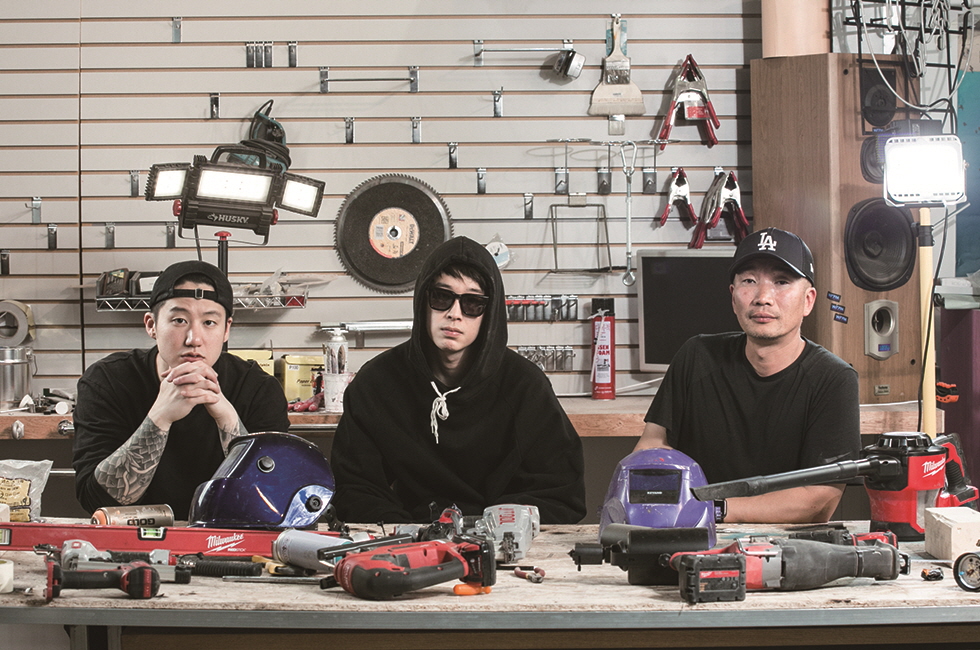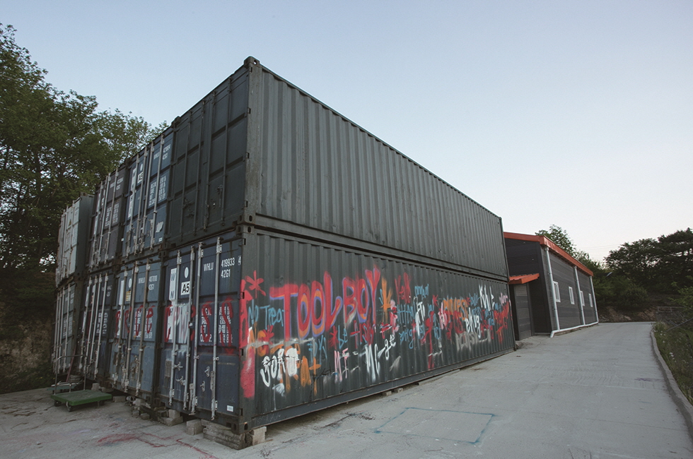 1, 2 지난봄 롯데갤러리 잠실 에비뉴엘에서 열린 전시 <Learning Process>. 툴보이가 작품과 공간 기획, 연출을 담당했다. 사진 제공 롯데갤러리 3 툴보이 메인 멤버. 왼쪽부터 그래피티·음악 프로듀서 아토(Ato), 가구·인테리어 디자이너 케이웨일(K.Whale), 미디어 영상감독 세르지오(Sergio). 사진 제공 서울산업진흥원 4 노들섬에서 열린 스트리트 컬쳐 플랫폼 올데이아웃 WTFC 전시(2019). 툴보이가 공간 기획·연출을 맡았다. 사진 제공 WTFM 5 아토, ‘Toolboy Lights’(2020), neon, 100x60cm. 사진 제공 롯데갤러리 6 툴보이가 공간 기획, 디자인, 시공을 담당한 이태원의 겸상 더 소셜베이스(2018). 사진 제공 WTFM 7 툴보이의 경기도 여주 작업실 밖 풍경. 그래피티로 뒤덮인 컨테이너 박스에는 툴보이의 예술적 재료가 되는 작은 오브제부터 가구, 오토바이, 대형 물품에 이르기까지 온갖 자재와 도구가 들어 있다. 사진 제공 서울산업진흥원