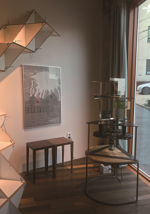 1층에 송 대표의 제작소와 나란히 자리 잡은 썸 컬렉티브는 디자인 가구와 예술 작품이 어우러진 공간으로, 조재원 작가의 친형인 조윤종 대표가 운영하고 있다. 2008년 LA에 J1스튜디오를 설립해 가구 디자이너로 활동하다 3년 전 한국으로 들어온 조 작가의 작품은 기본 모듈을 통해 자유로운 변형과 확장이 가능한 실용성을 갖추었다. 거기에 나무 소재가 지닌 따뜻함을 모던하게 잘 풀어낸 담백한 미학을 품고 있다. 쇼룸에는 조 작가의 가구뿐 아니라 강성 등 다른 디자이너들의 작품, 그리고 디르크 플라이슈만(Dirk Fleischmann), 타이드 오닐(Taidgh O’neill)을 비롯해 박경근 작가의 예술 작품들도 만나 볼 수 있어 작지만 알찬 전시장 역할을 한다. 필동 팩토리는 그룹 명칭도 상호도 아니지만 ‘따로, 또 같이’ 뭔가를 할 수 있겠다는 신뢰와 공감대를 만들어준, 협업의 뿌듯한 첫 결과물이다. 박경근 작가는 현재 구상 단계라 구체적인 계획은 밝힐 수 없지만 조재원 디자이너, 송병익 대표와 꾸려갈 창조적 협업의 영역을 좀 더 확장해보고 싶다고 말한다. 이 시대의 연금술사 같은 송 대표와 늘 아이디어와 해결책을 의논할 수 있기에 두 작가는 더 든든하고, 의욕이 솟을지도 모르겠다. 현대미술을 하는 예술가, 가구 디자이너, 엔지니어의 삼각 구도가 일궈낸 공간의 미학이 앞으로는 어떤 방식으로 진화할지, 어떤 흥미로운 창조물을 탄생시킬지 궁금해진다