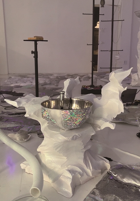 1밴드바우어(Bandbower), 지난해 서울 논현동의 전시 공간 플랫폼엘에서 열린 전시 <Birds Eye View>. 2 밴드 바우어, 360도로 회전하며 빛의 반사를 이용해 눈밭의 영롱함을 표현하는 조각 오브제. 3 밴드바우어 멤버들. 왼쪽부터 조각·설치미술가 고요손(Goyoson), 공간 연출가 승택(Seungtaek), 싱어송라이터 샤이 아시안(Shy Asian). 4 지난 5월 퓨처소사이어티에서 열린 전시 <춘몽(春夢)>. 5 밴드바우어, 전시 <춘몽(春夢)>의 비행 지형도 일부. 6 밴드바우어, 분수가 나오는 사운드 오브제. 1~6 사진 제공 밴드바우어