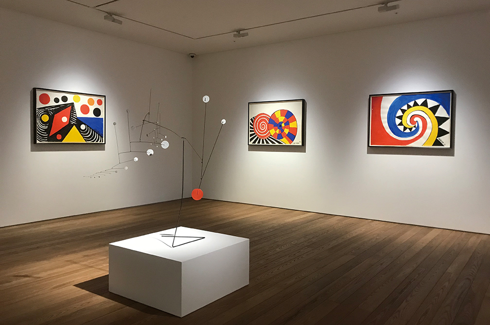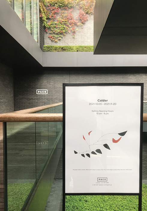 글로벌 미술계에서 손꼽히는 브랜드 파워를 자랑하는 페이스갤러리는 원래 작게나마 서울에 지점을 두고 있었다. 그러다가 올여름 ‘페이스’다운 규모와 외양을 지닌 새 전시 공간을 꾸려 선보였는데, 리움미술관에서 조금만 대로로 내려오면 마주치는 건물인 서울 한남동 르베이지 빌딩에 들어섰다. 이 건물의 두 층을 아우르는 약 800㎡에 펼쳐져 있는 갤러리 공간의 레노베이션은 조민석 대표가 이끄는 매스스터디스에서 맡았다. 우아한 야외 정원도 작품의 전시 무대가 된다. 페이스갤러리 서울점은 원래도 수준 높은 작품을 선보여오긴 했지만, 새로 문을 연 이래 샘 길리엄, 조엘 사피로 등 세계적으로 무게감을 지닌 작가들의 전시를 예전보다 규모 있게 펼쳐내면서 한층 주목받고 있다. 현재는 우리나라 대중에게도 친숙한 이름인 모빌 조각의 상징과도 같은 알렉산더 칼더(Alexander Calder)의 개인전이 진행 중이다(미국 MoMA와 베를린 신국립미술관 등에서도 개인전이 열리고 있다). 이번 전시는 금속과 철사로 제작한 모빌 등 칼더가 30년 동안 작업한 조각 작품의 일부를 서울에서 관람할 기회이기도 하지만, 그의 종이 작품 8점을 접할 흔치 않은 기회이기도 하다. 대중에게는 덜 친숙할 수 있지만, 칼더의 작업 전반에서 매우 중요한 부분으로 여겨지는 종이 작품 중 1960년대와 1970년대에 제작한 잉크와 과슈 작품은 칼더가 주로 말년에 사용했던 매개체라고 한다.