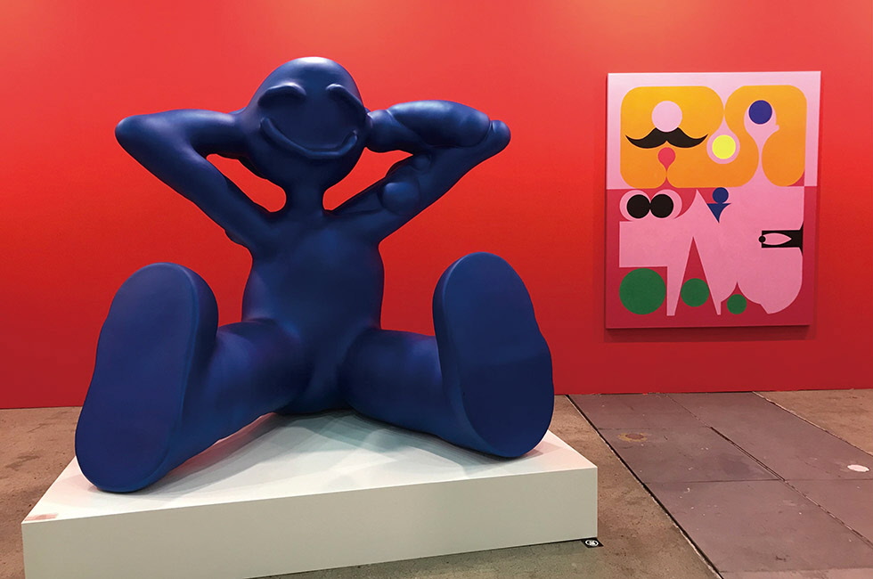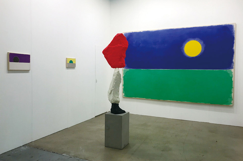 오프라인 행사에 대한 목마름, 그리고 지난해 높은 인지도를 자랑하는 유럽 화랑이 참가해 거둔 실적이 나쁘지 않은 덕분이었을까? 명단이 대폭 축소된 와중에도 글로벌 아트 페어를 다녀봤다면 꽤 익숙하게 느껴질 이름들이 아트부산 & 디자인 2020 현장에서도 눈에 띄었다. 작년에 이어 쾨니히 갤러리(Ko··nig Galerie), 페레스 프로젝트(Peres Projects) 같은 독일 갤러리가 부스를 차렸고, 오스트리아의 갤러리 타데우스 로팍, 뉴욕 기반의 글래드스톤 갤러리 등 명성 높은 화랑이 새롭게 합류했다. 독일 신표현주의 회화의 거장으로 거꾸로 있는 사람의 형상으로 유명한 게오르그 바셀리츠(Georg Baselitz)의 대작을 내건 갤러리 타데우스 로팍은 안토니 곰리, 알렉스 카츠 등 한국에서도 잘 알려진 작가를 비롯해 올리버 비어 같은 떠오르는 작가도 함께 선보였는데, 단연 무게감이 돋보였다. 지난해 도나 후앙카(Donna Huanca)의 인상적인 회화 등으로 인기를 끈 베를린 기반의 화랑 페레스 프로젝트는 올해도 SNS에서 뜨거운 반응을 보인 부스를 꾸몄다. 기분 좋은 미소를 띠고 앉아 있는 파란색 대형 조각(오스틴 리 작가)을 비롯해 내년 광주비엔날레에서도 소개될 아르헨티나의 애드 미놀리티 등 참신한 여성 작가의 작품들을 내놓았다. 이 밖에도 리먼 머핀, 탕 컨템퍼러리 등 제법 ‘글로벌 아트 페어’ 분위기가 나는 해외 갤러리의 라인업과 더불어 국제갤러리, 가나아트, 갤러리현대, PKM갤러리 등 대다수 국내 메이저 화랑은 물론 밀레니얼 세대의 감각을 엿볼 수 있는 기획전 <아트 악센트>, 아트 토이 등 국내 컬렉터들의 문화를 보여주는 <보통의 컬렉터>전 등으로 전반적인 짜임새가 다양한 편이었다.