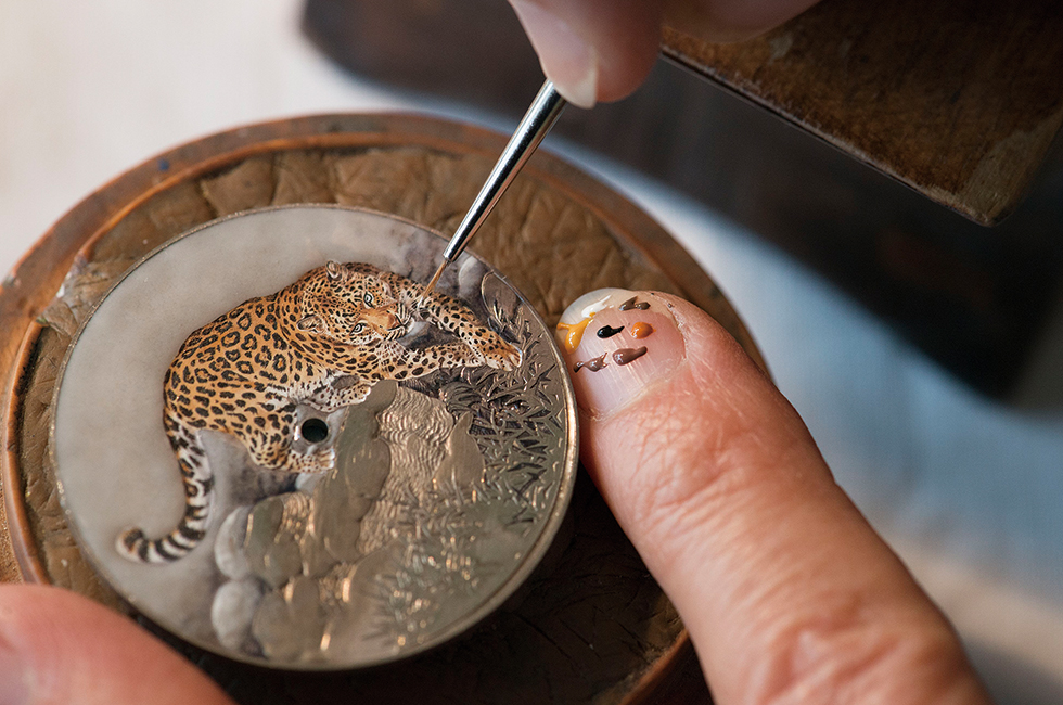 2016년 에르메스의 테마는 ‘자연으로의 질주’다. 이미 2016 S/S 컬렉션을 통해 동물화가 로베르 달레의 작품을 담아낸 에르메스는, 시계에도 그의 일러스트레이션을 적용했다. 1980년대에 메종과 작업한 아티스트 로베르 달레의 그림 속 호랑이를 ‘아쏘’ 워치의 다이얼 위에 형상화해 ‘아쏘 타이거’를 탄생시킨 것. 신비하고 강인한 느낌을 내기 위해 에나멜링의 한 종류인 에마유 옹브랑(명암이 표현된 에나멜) 기법을 사용했다. 이 기법을 시계에 적용하기까지 꼬박 2년이라는 준비 기간이 소요됐을 정도로 공을 들였다. 여기에 인그레이빙 기법까지 첨가했다. 본래 프랑스 리모주 도자기 제작에 사용하던 이 기술은 전통적인 양각 기법과는 다르게 표면을 얕게 음각한 후, 그곳을 유약으로 메워 빛이 투과할 때 음각과 양각에 따른 음영이 드러나 미스터리한 분위기를 풍긴다. 총 12점 한정판으로 셀프와인딩 인하우스 무브먼트 H1837로 시침과 분침을 움직인다. 인그레이빙과 에나멜링, 두 장인의 협업을 바탕으로 한 워치는 또 있다. ‘슬림 데르메스 포켓 판테르’다. 멸종 위기에 처한 인도차이나 표범인 ‘Panthera Pardus’의 우아한 자태를 그려낸 것으로 역시 로베르 달레가 그린 일러스트레이션을 다이얼에 담았다. 표범의 형상은 ‘그랑 푀’ 에나멜링 기법으로 구워냈는데, 다이얼이 완성되기까지 에나멜 파우더를 다이얼에 입히기 위해서는 엄청난 인내심을 필요로 한다. 눈 쌓인 배경에서 두 기술의 조화는 절정을 이룬다. 여기에 2.6mm의 울트라 신 무브먼트 H1950이 장착되어 있다. 인그레이빙과 에나멜링 기법으로 새로운 작품을 완성한 ‘아쏘 타이거’나 ‘슬림 데르메스 포켓 판테르’는 에르메스의 예술혼을 보여주기에 충분해 보인다.