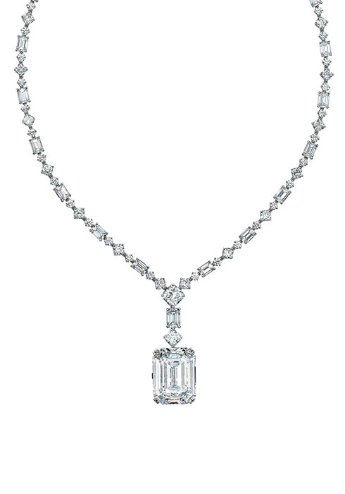 1 D컬러 IF등급의 40.22캐럿 에메랄드 컷 다이아몬드 드롭을 총 35캐럿의 믹스드 컷 다이아몬드와 플래티넘에 세팅한 네크리스.