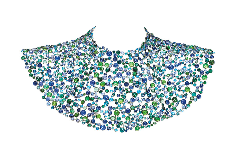 4, 5 블루 & 그린 투르말린, 탄자나이트 등 팬시한 젬스톤으로 만든 파워풀한 네크리스. 공기, 땅, 물, 불을 상징하는 활기찬 컬러가 인상적이다.