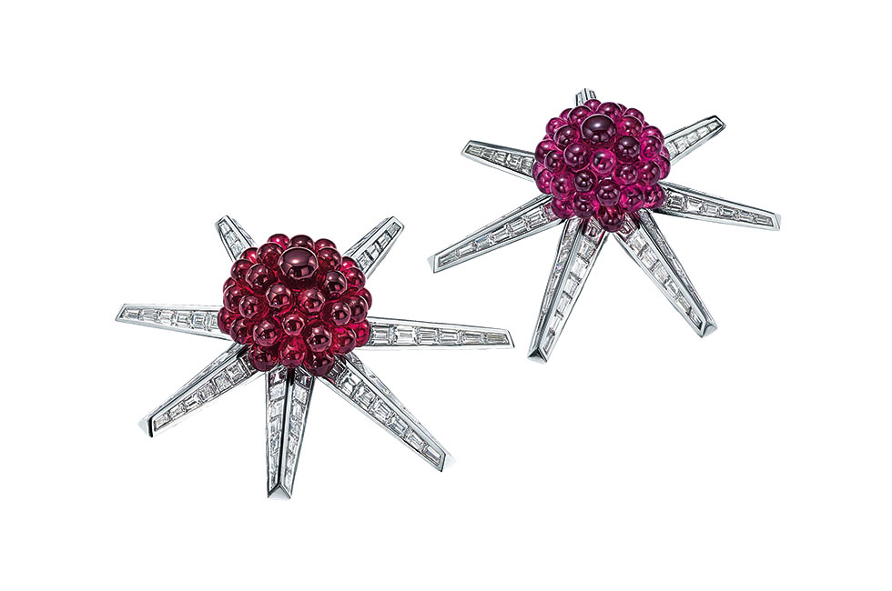 11 1930~40년대 티파니 아카이브 주얼리 디자인에서 얻은 영감으로 탄생시킨 이 매력적인 브로치는 건축학적 대칭이 두드러진다. 루벨라이트와 핑크 투르말린 비드를 집중적으로 센터에 세팅했으며 맞춤 제작한 바게트 컷 다이아몬드를 칼날 같은 형태의 플래티넘에 입체적, 기하학적으로 세팅했다.