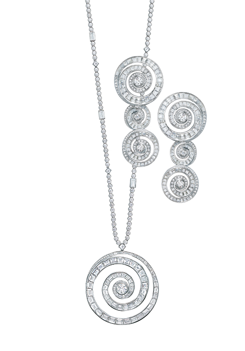 13 1880년대 아카이브 스케치에서 영감을 얻어 탄생시킨 진주조개 문양의 나선형 디자인. 점층적으로 커지는 라운드와 바게트 컷 다이아몬드를 커브 진 표면을 따라 촘촘히 세팅했다.