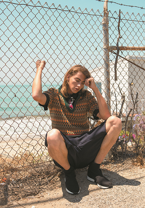 패턴 니트 톱, 프린트 반소매 셔츠, 네이비 쇼츠 모두 가격 미정 프라다.